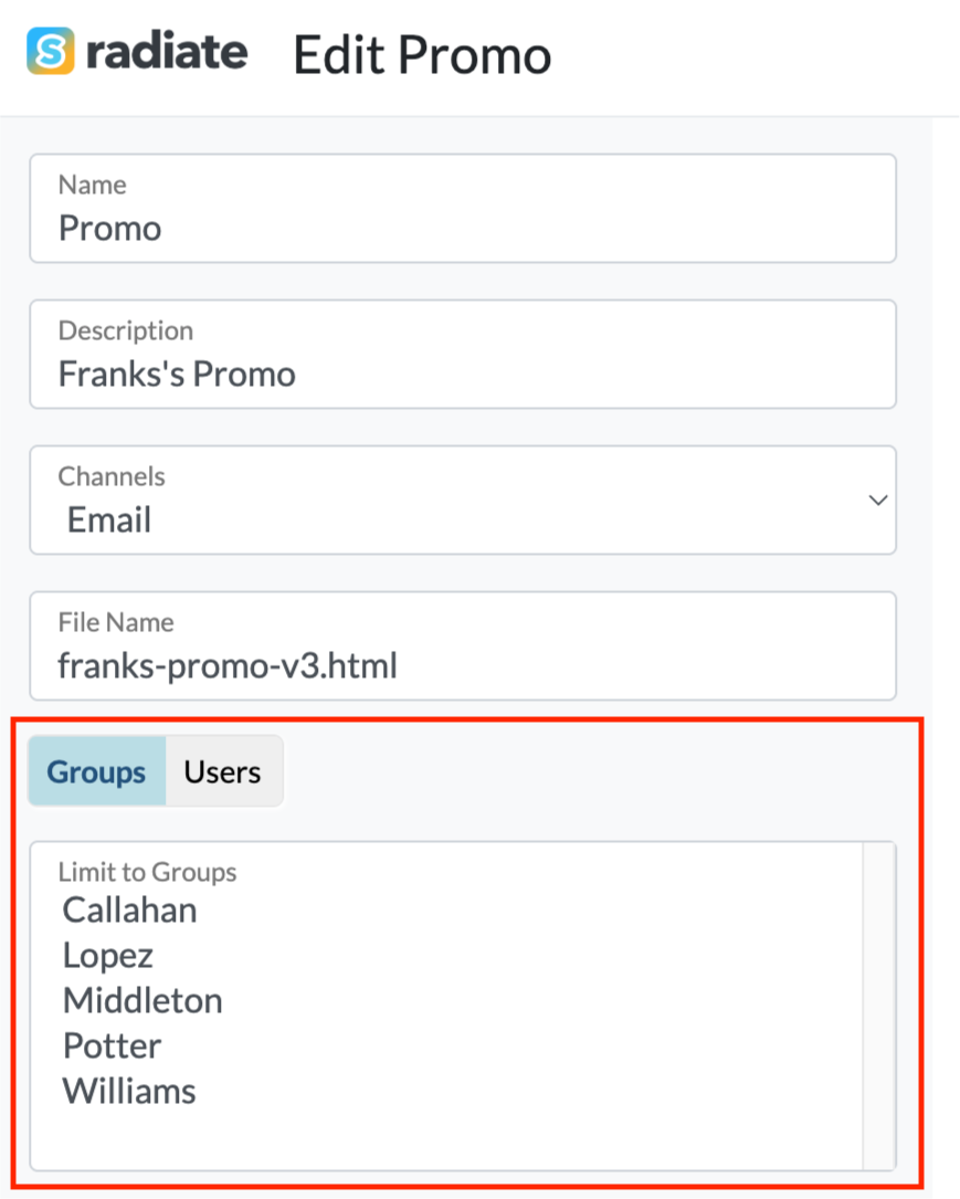 In the Edit Template pop-up window, admins can limit a base template to be visible to specific Groups or Users.