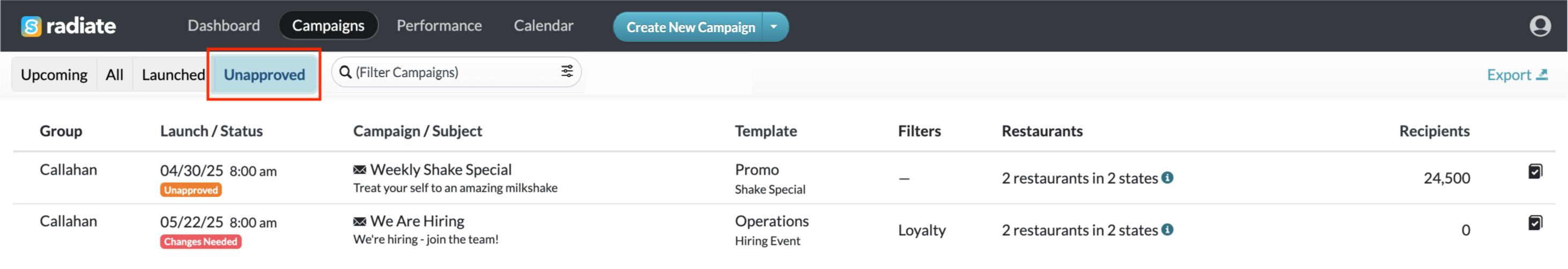 - In the resulting screen, click on Unapproved to view campaigns that have been submitted by Users from all Groups, but have not yet been approved.