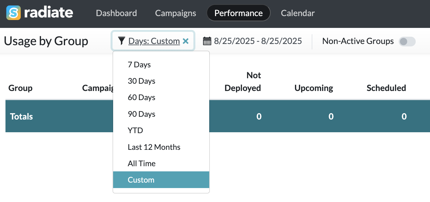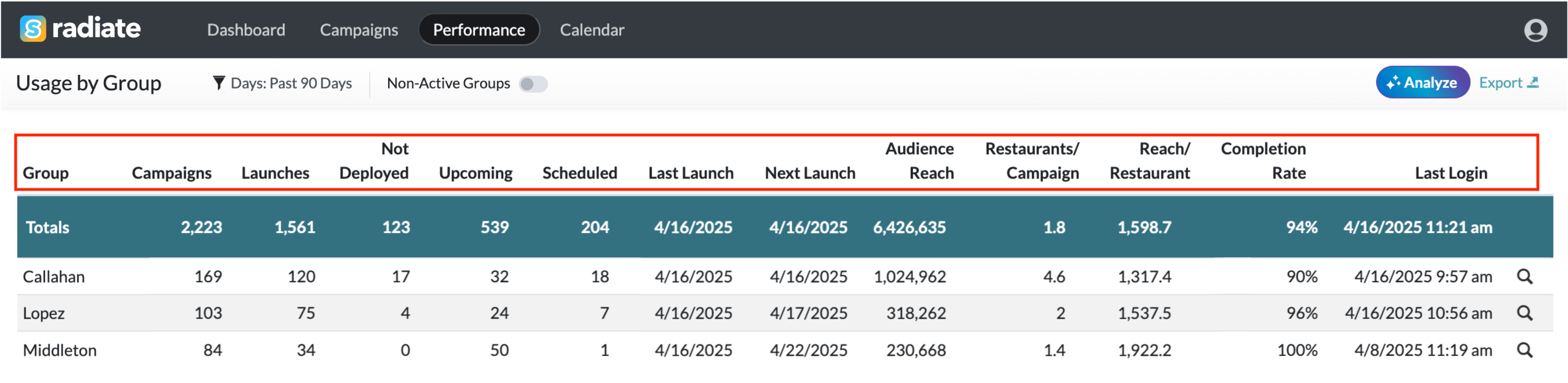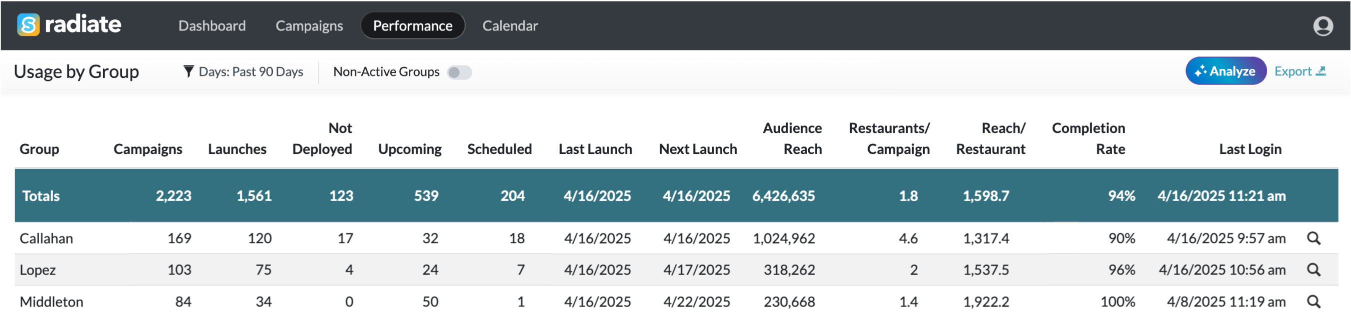 Last Login | The last time that a User associated with the Group logged in to Radiate, regardless of the timeframe selected |