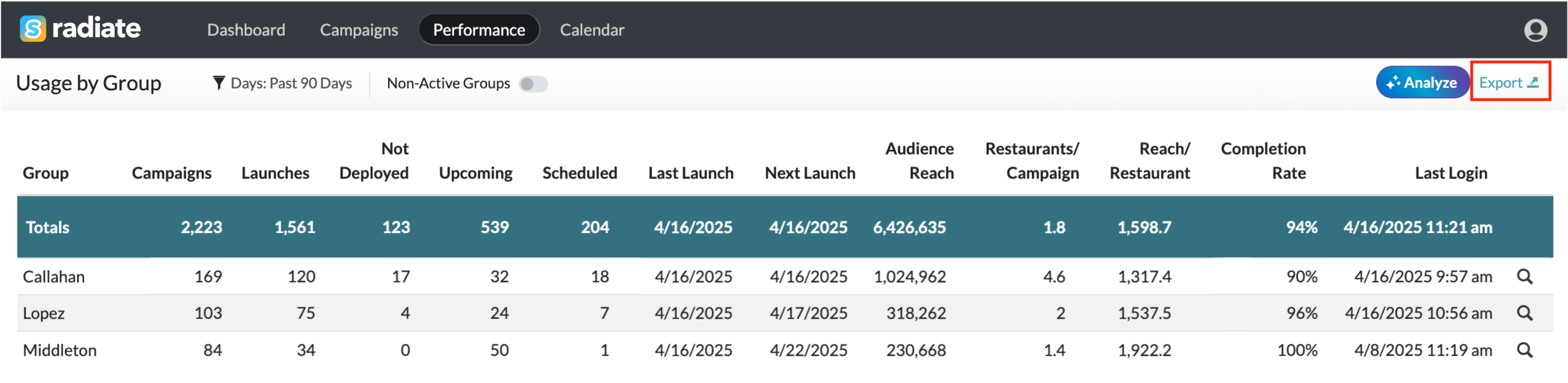 Click the blue Export button in the top right corner of the screen to download a file with usage reporting by group data.