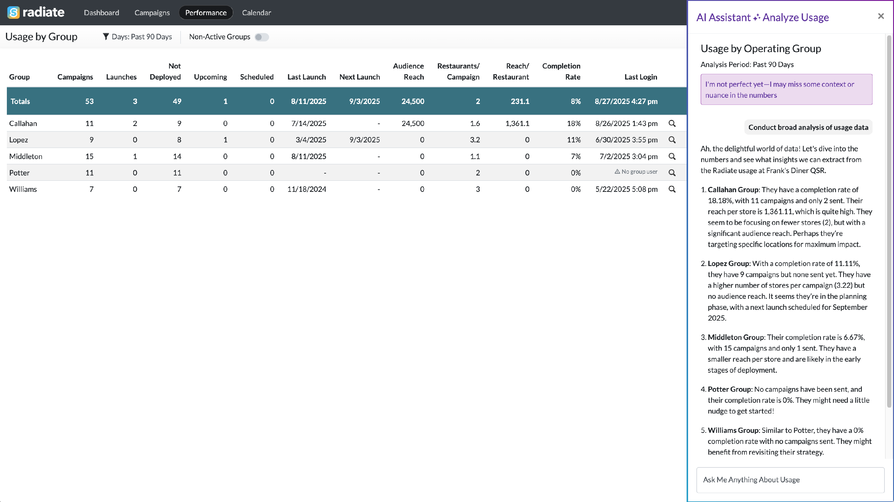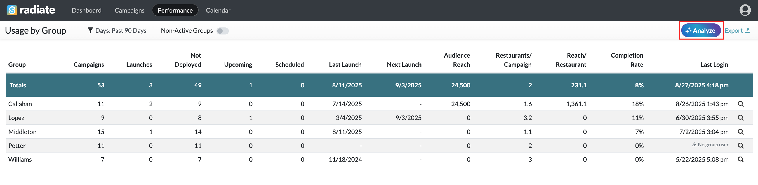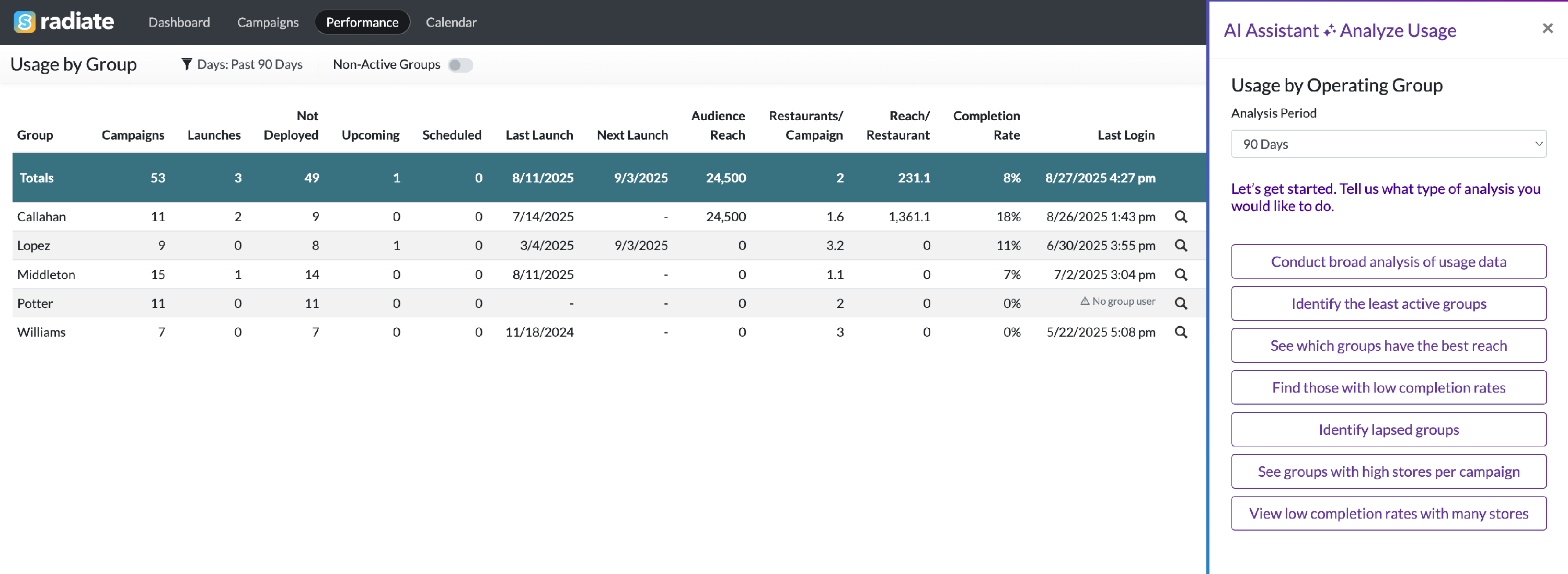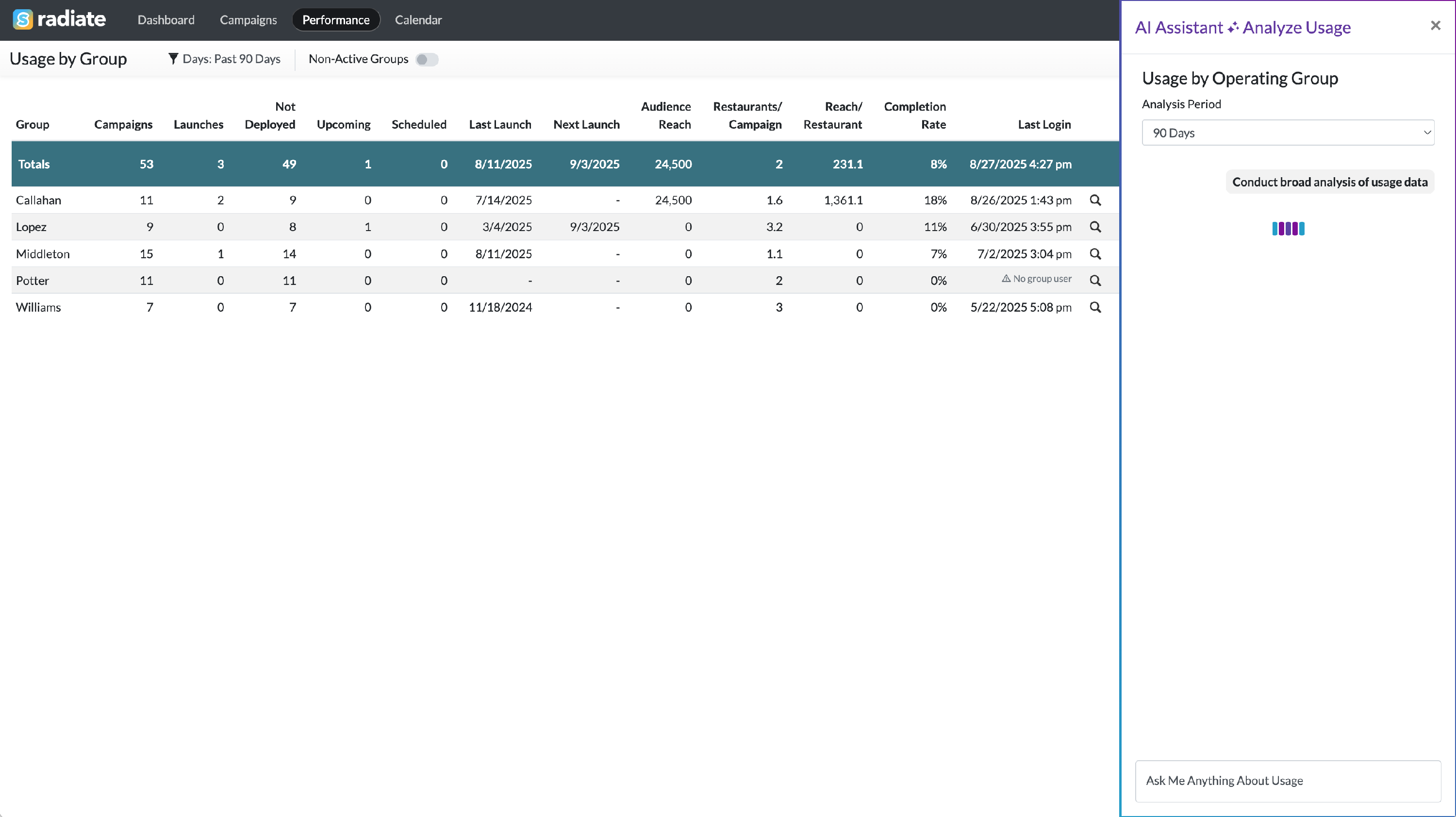 The AI Analyze Usage by Group feature provides insights into how different groups in your organization are using Radiate. It summarizes activity, highlights trends, and helps you identify patterns that can improve adoption and engagement.