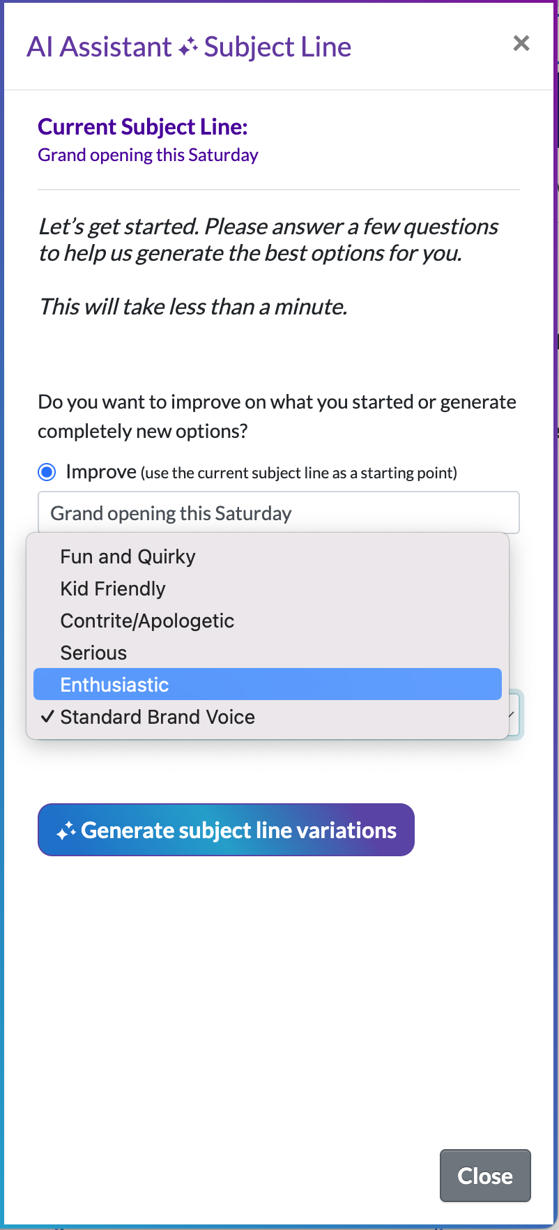 If you have an existing subject line, you can select Improve to use it as a starting point.