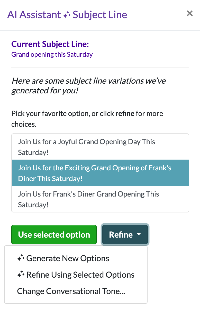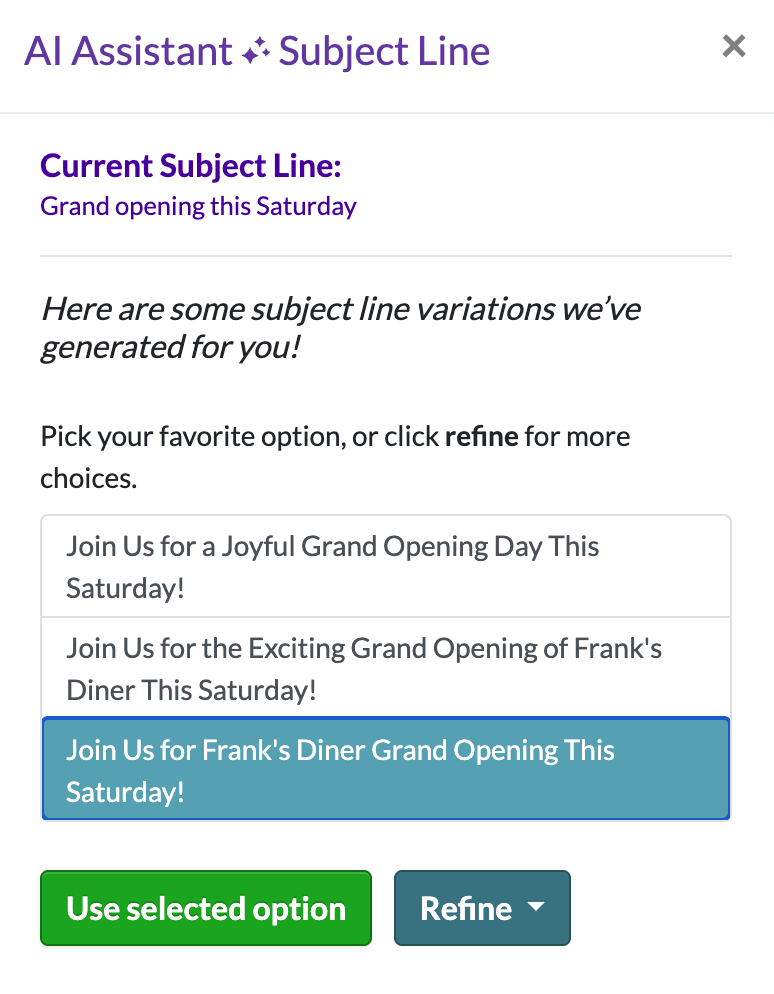 If you see one you would like to use, select it and click the green Use Selected Option button. This will populate the Subject Line box with the option.