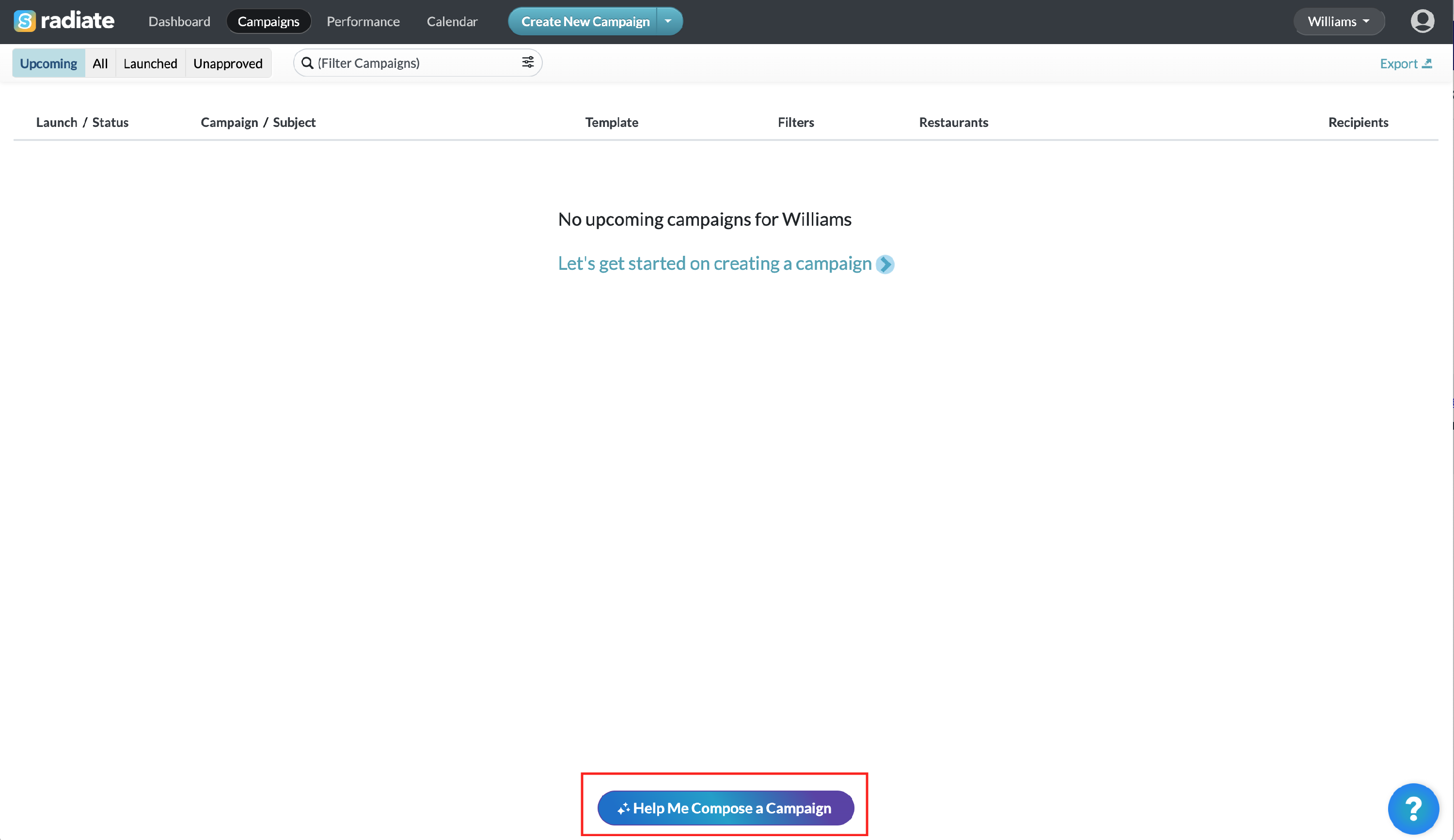 On the Campaigns page, click the Help Me Compose a Campaign button.