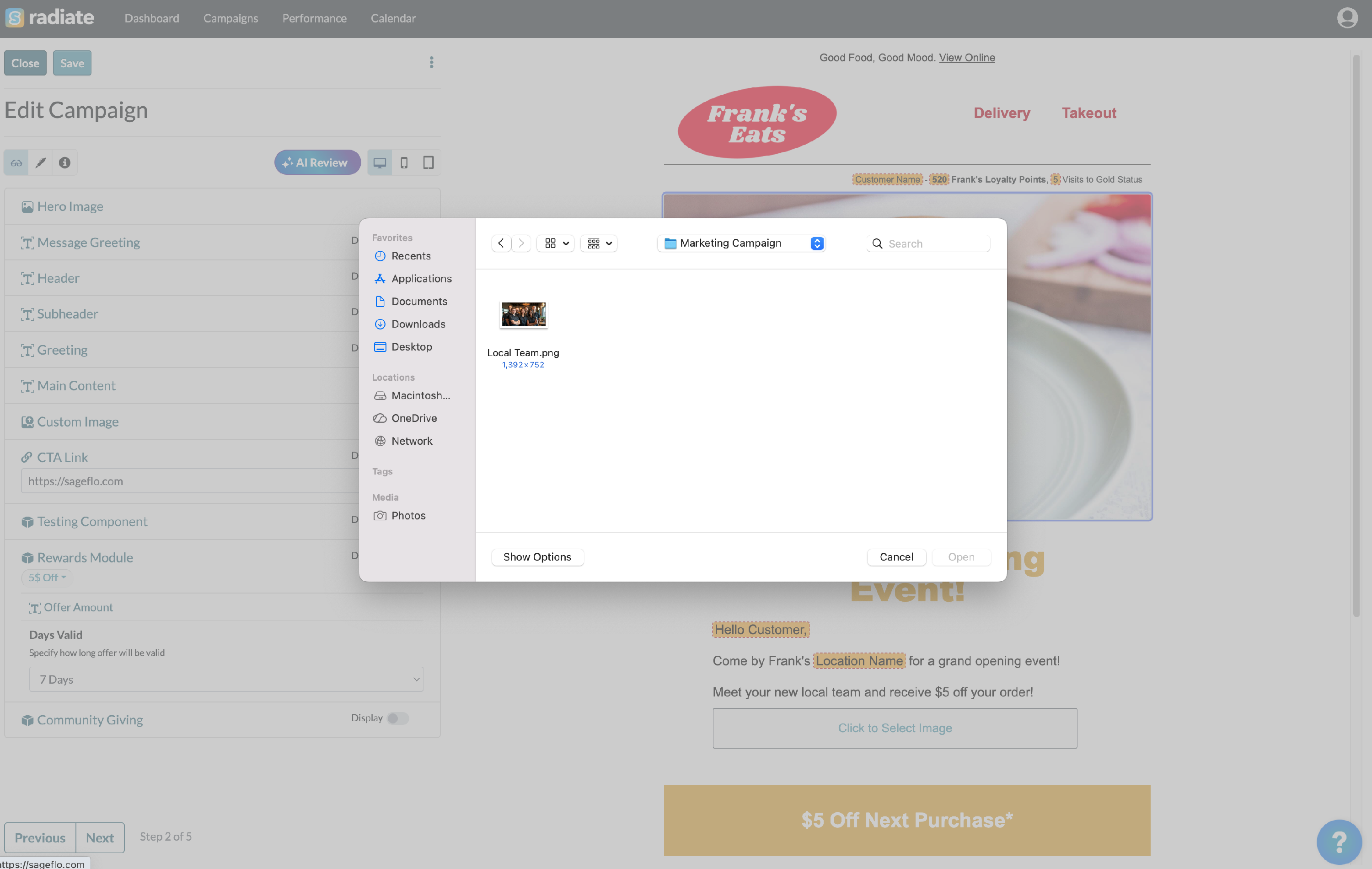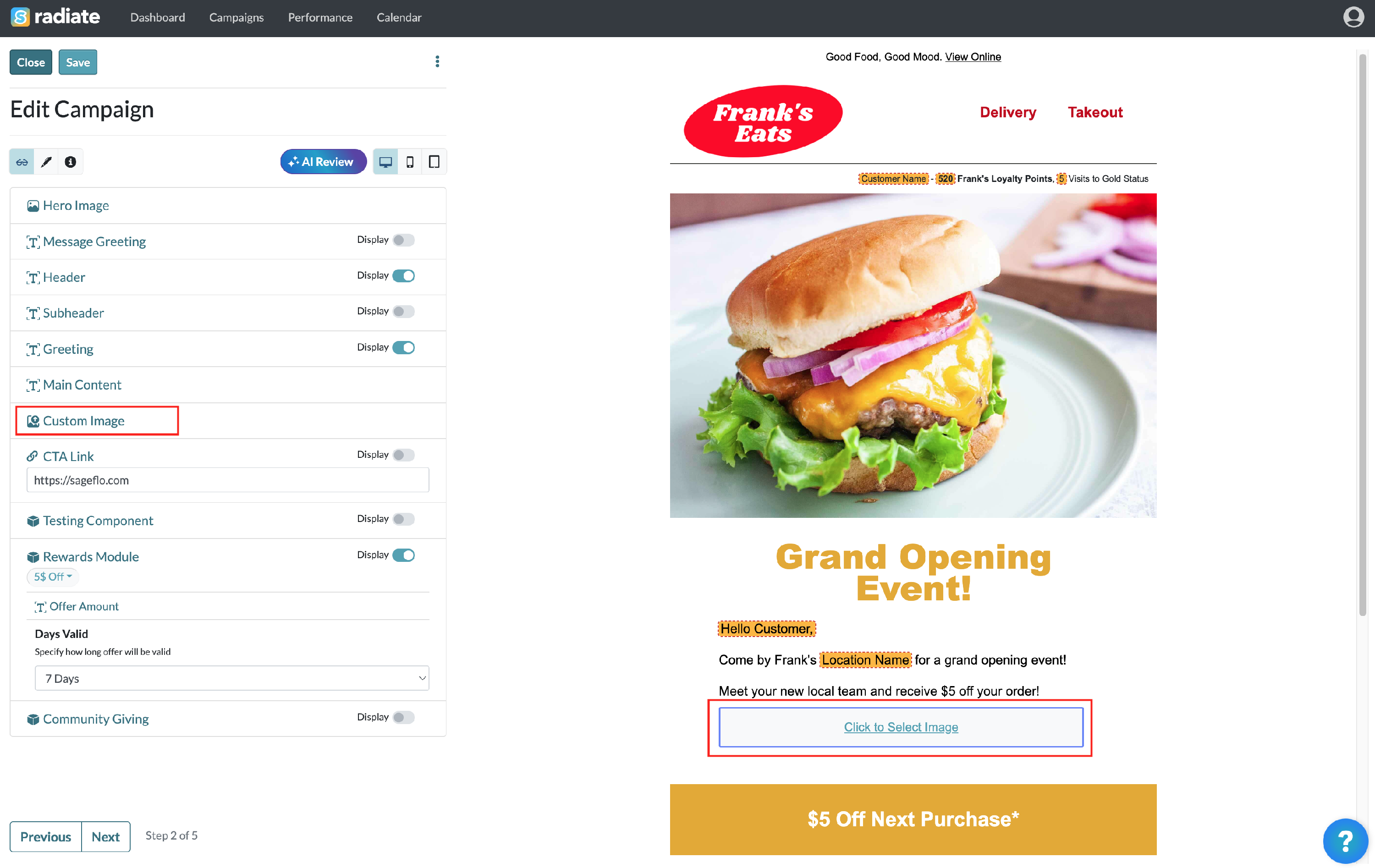 Some accounts and templates include custom image modules that allow you to upload your own images directly into a campaign. These modules make it easy to personalize your campaigns further or highlight content specific to your location.