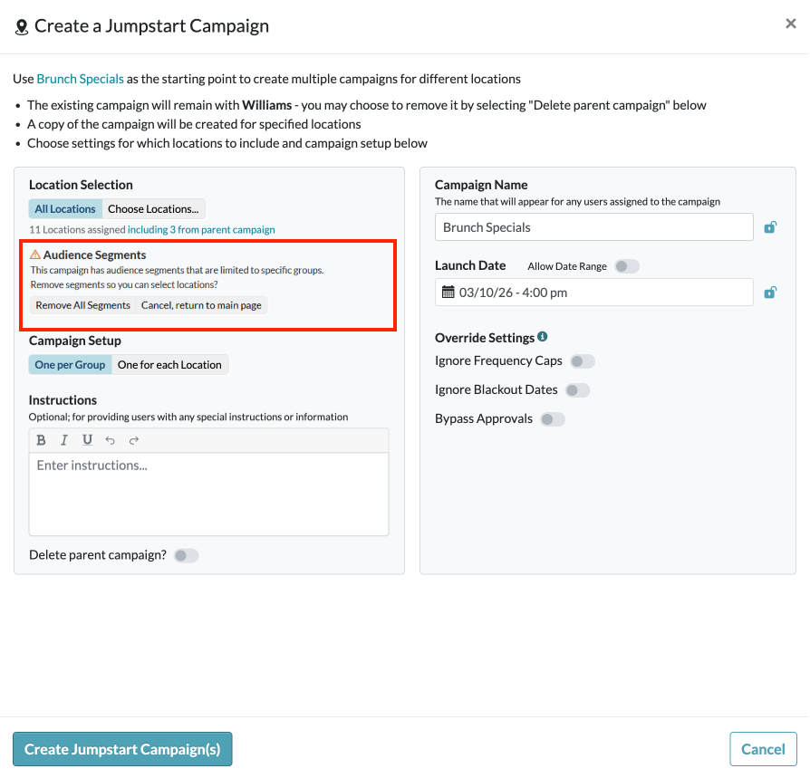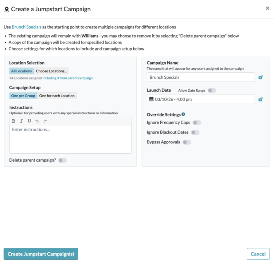 - In the Create a Jumpstart Campaign window, choose settings for which locations to include and campaign setup.