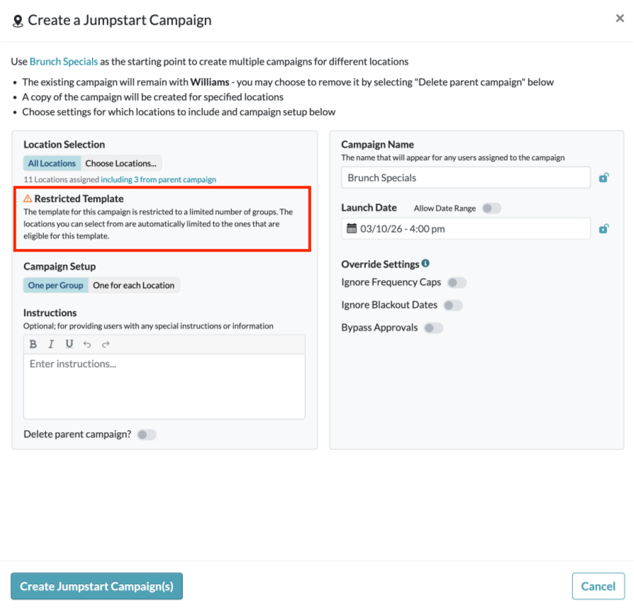 - Override Settings - Optionally, allow for ignoring frequency caps, ignoring blackout dates, and/or bypassing approvals when scheduling campaigns created from this Jumpstart Campaign.
