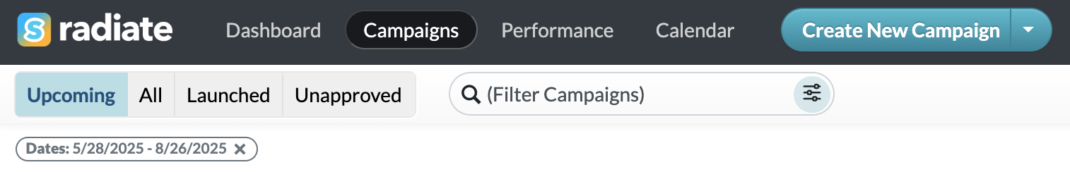 On the Campaigns page, the filter bar allows you to filter campaigns in a few different ways.
