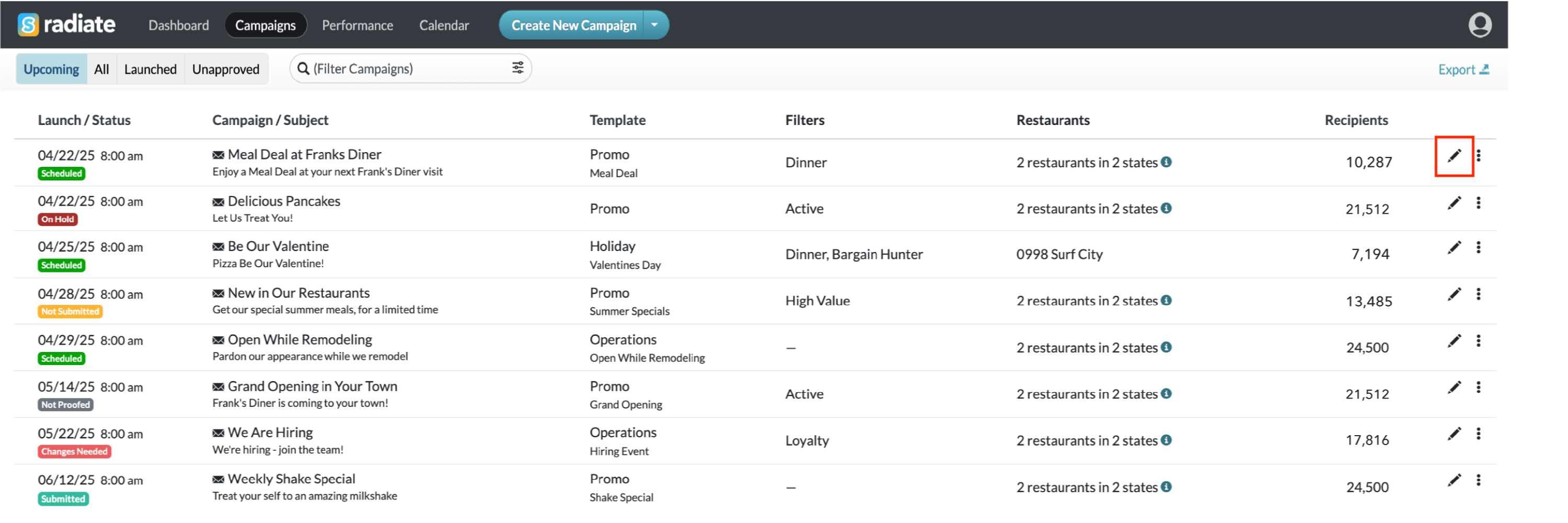 - Click on the pen icon or double-click the campaign row to be taken to the Scheduling step.