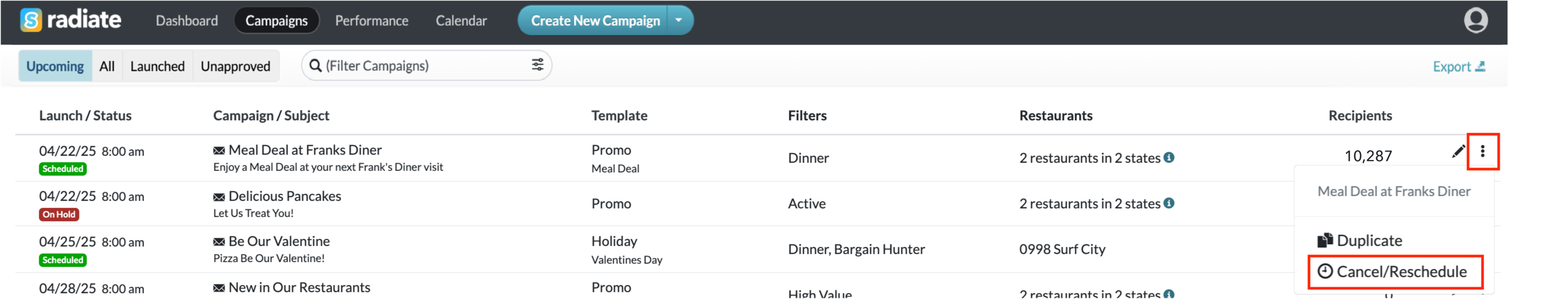 - In the Campaigns Overview page, search for the campaign you need to reschedule.