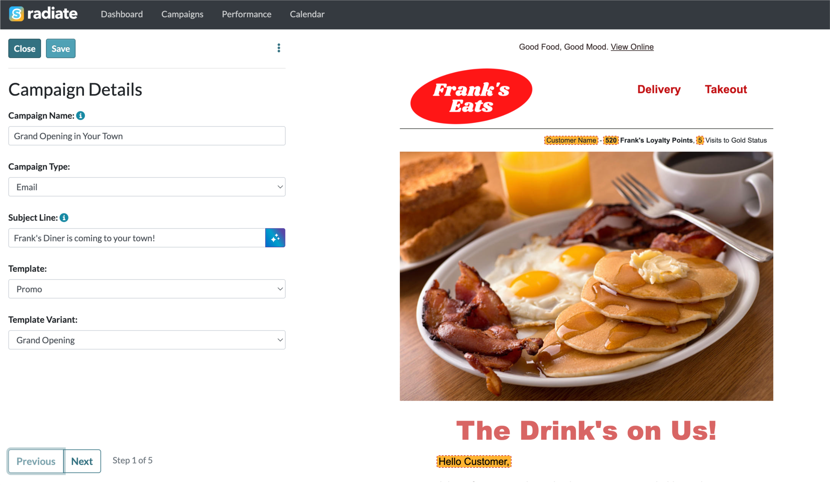 From the Campaigns tab in Radiate, click on the blue Create New Campaign button. View all templates at a glance or filter by type. Select a template to start a new campaign.