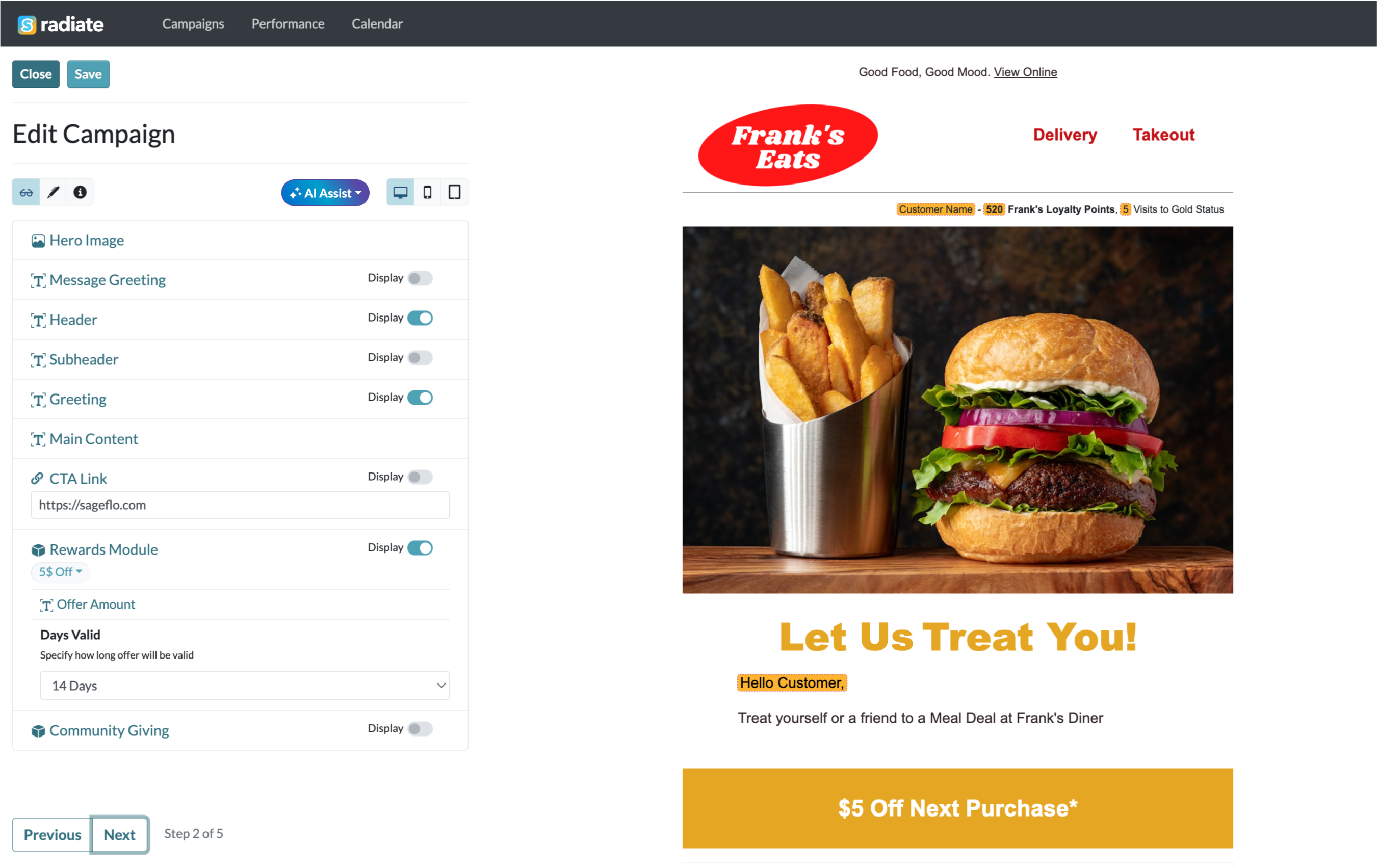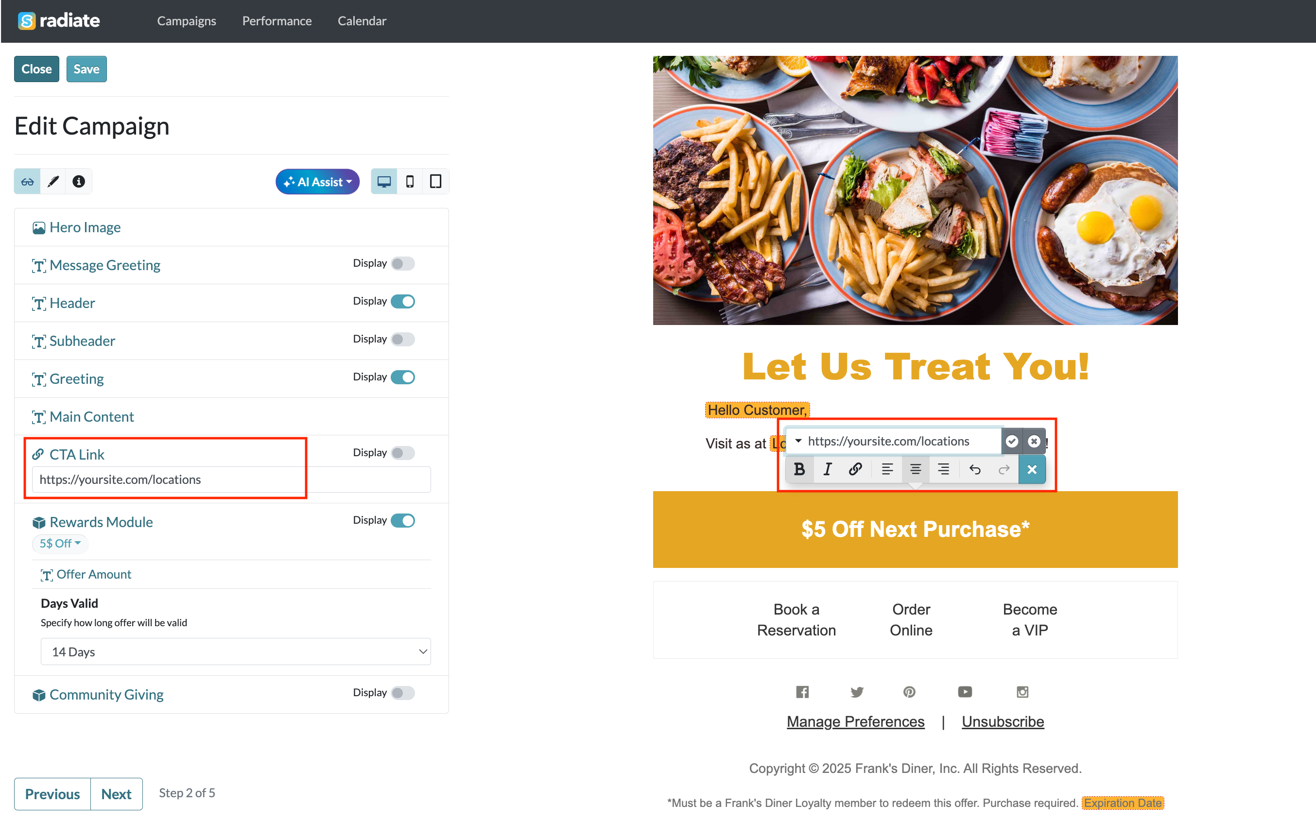 - Click into an editable section in the campaign to bring up the formatting toolbar or Display toggle for that section.