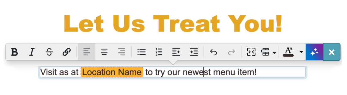 Some editable sections such as the Header and Subheader may allow for formatting options. When you click on such an editable section, a formatting bar will appear at the top that will allow you to apply brand-approved formatting options. If you do not see the formatting toolbar, your corporate team has formatting locked for that section.